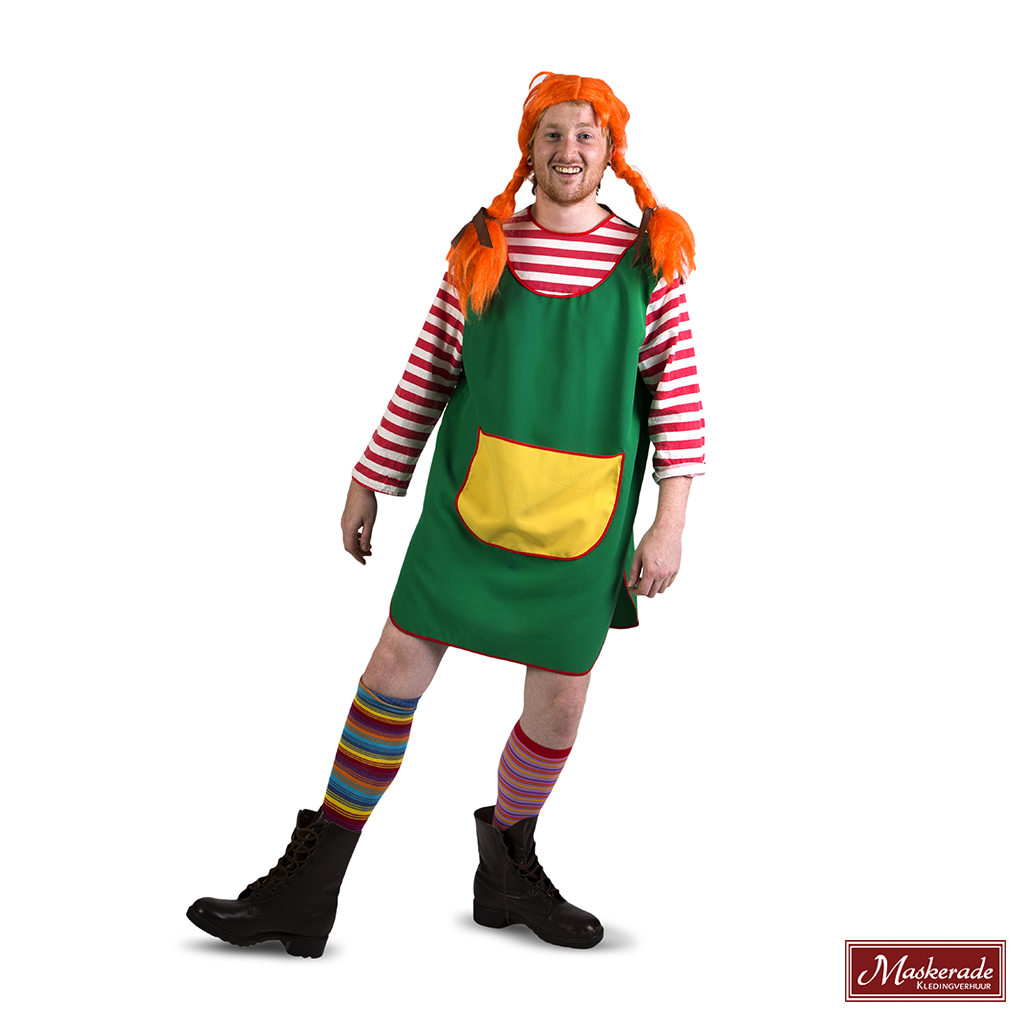 Dit Pippi Langkous kostuum bestaat uit een groene jurk met rood wit gestreepte mouwen, verschillend gekleurde kousen en een oranje pruik met vlechten.