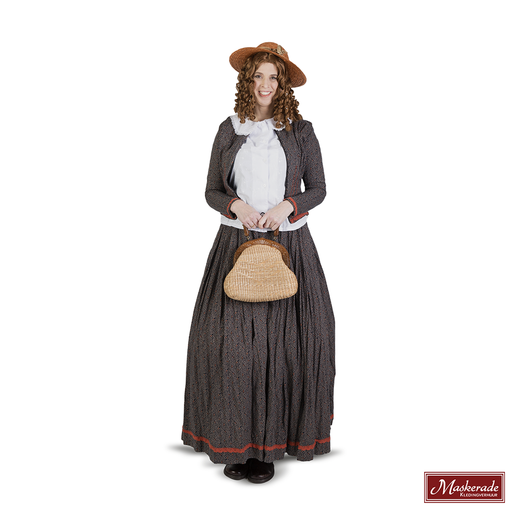 Dit Dickenskostuum bestaat uit een donkerblauwe jasje en bijpassende rok met kleine bloemenprint daaronder een hooggesloten witte blouse. Dit kostuum is uniek, er is er maar 1 van. De bijpassende hoed kost 4 euro extra.