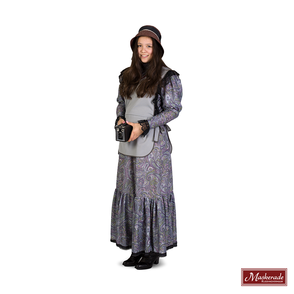 Deze synthetische grijze Dickensjurk met bloemenmotief is hooggesloten en met lange mouwen, over de jurk zit een grijs overschort. De jurk is in vele maten op voorraad, er geschikt voor grote groepen, door het elastieken in de taille past de jurk snel. De bijpassende hoed kost 4 euro extra.