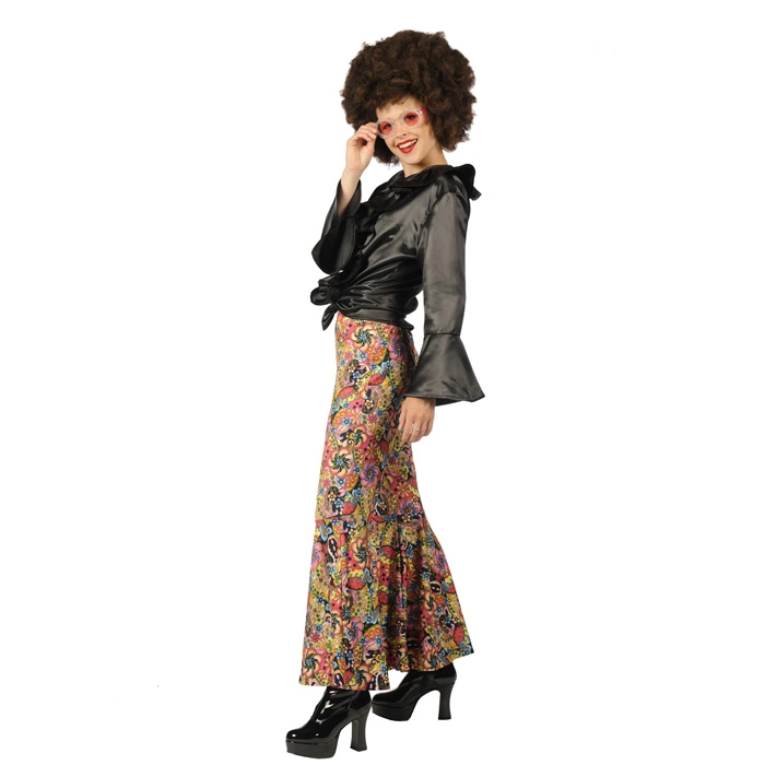 Deze bloemenprint broek heeft wijde pijpen en is van elastische stof. Erboven een zwarte glanzende blouse met roezen. Deze broek staat nu bij de disco categorie, maar als je hem met hippie accessoires draagt (lange stijle pruik, retro blouse) dan kan het als hippie kostuum. De broek past zowel mannen als vrouwen en wordt erg vaak uitgekozen omdat hij zo lekker zit.
