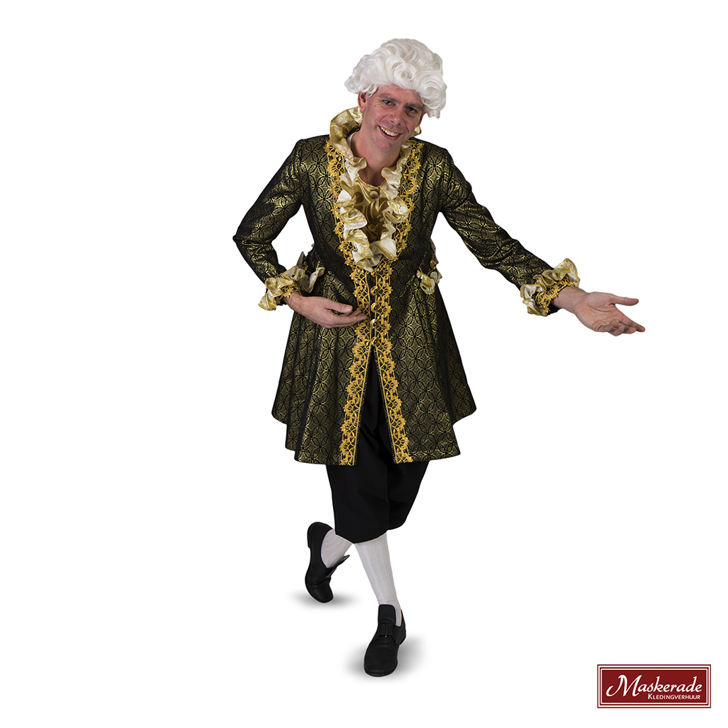 Dit renaissancekostuum bestaat uit een lange glanzende jas met print en met goudband afgebiesde revers en een opstaand gouden rouche bij de hals. Daaronder een wit hooggesloten gilet en een zwarte pofbroek. Inclusief witte kniekousen, schoengespen en chabot. We hebben twee dameskostuums die hierbij passen, zowel RENS409BB als RENS410BB.