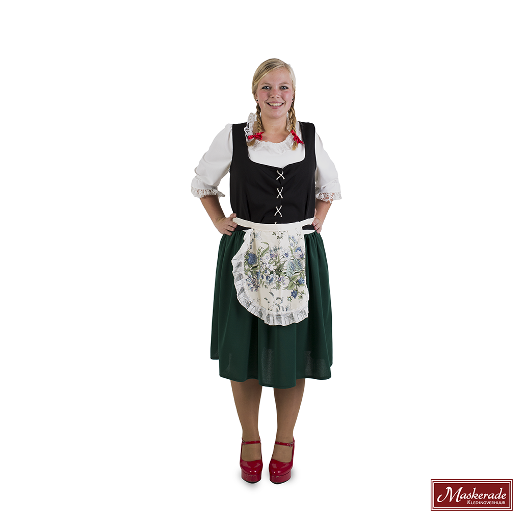 Deze groene Tiroler jurk bestaat uit een witte blouse die vast zit aan een groene rok. De jurk heeft elastiek in de taille en een losse zwarte bustière met rijgveter. Met een bijpassend gebloemd schortje.