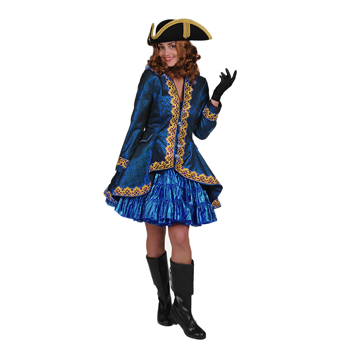 Dit kostuum bestaat uit een jasje met lange mouw en siersluiting (met blinde sluiting) aan de voorkant, de onderkant van de jas loopt de onderkant van de jas loopt wijd in tegenstelling tot RENS409 welke recht loopt. Daaronder een metallic petticoat met elastieken in de taille. Het kostuum zit comfortabel en past vrij snel. Hij is er in verschillende kleuren.