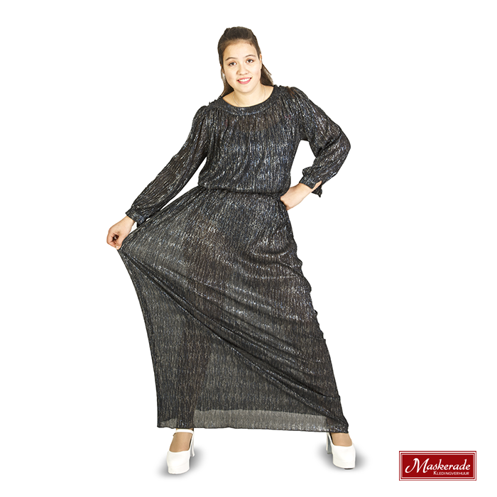 Deze lange wijde disco jurk is heel typerend voor die tijd, met de lange mouwen, wijdvallende stof met elastiek in de taille en natuurlijk het glitterprintje.