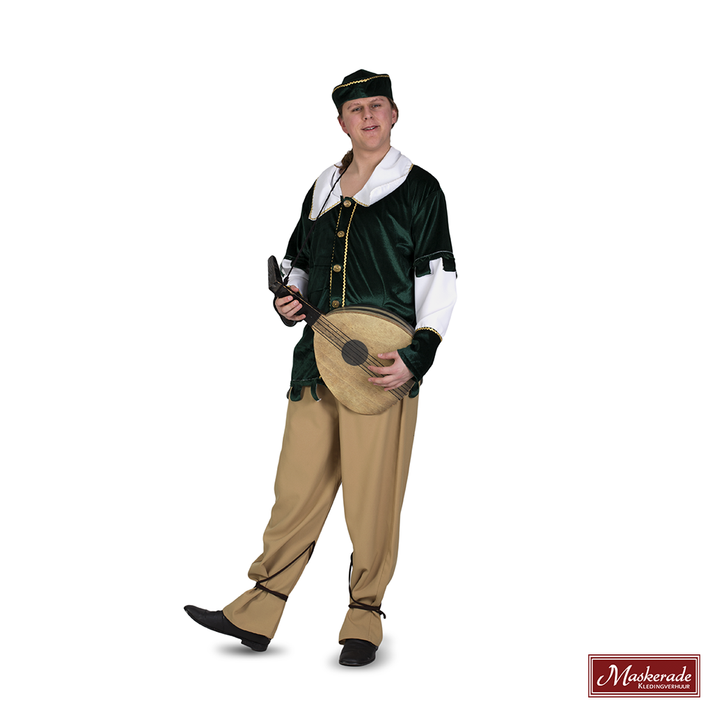 Dit Robin Hood kostuum bestaat uit een groen fluwelen hes met witte mouwen en kraag, daaronder een beige broek. De pet is 4 euro extra De kruisboog is 8 euro extra.