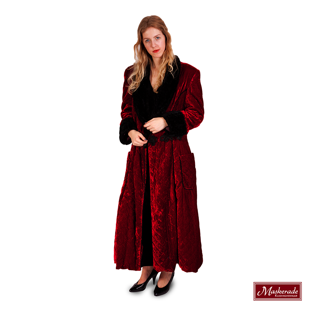 Luxe zwaar velourse zwarte mantel met een langharige kraag van bruin nepbont. De mantel heeft een lange sleep.