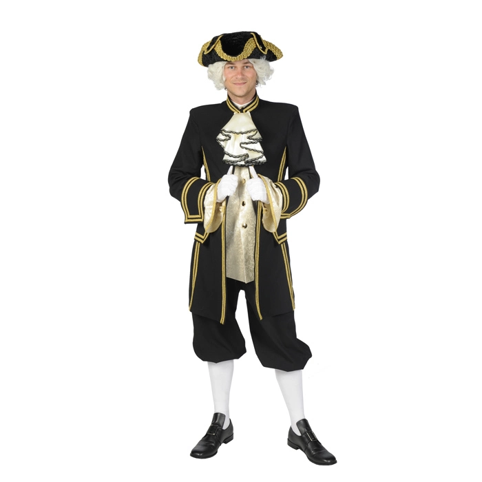 Dit renaissancekostuum bestaat uit een zwarte lange jas, met gouden borduursel, met daaronder een wit hooggesloten gilet en een zwarte pofbroek. Inclusief witte kniekousen, schoengespen en chabot. Dit kostuum is bijpassend bij dameskostuum RENS407MK40