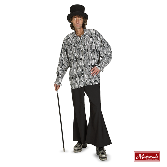 Dit kostuum bestaat uit een zwart wit gestreepte blouse met circelprint met een zwarte broek met wijde pijpen. Van deze print zijn ook een jas en broek,zie art.nr. DISCO560